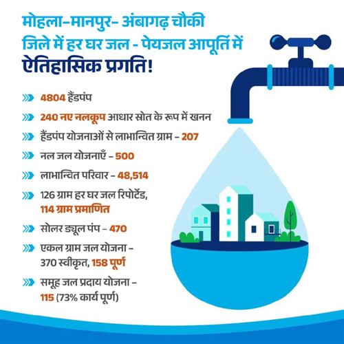 इस तरह, वर्ष 2025 तक मोहला-मानपुर-अंबागढ़ चौकी जिले में लगभग 48 हजार 514 परिवारों को घर-घर नल से शुद्ध पेयजल मिलना जिले के लिए एक बड़ी उपलब्धि है और हर घर जल के लक्ष्य की दिशा में महत्वपूर्ण कदम साबित हुआ है।