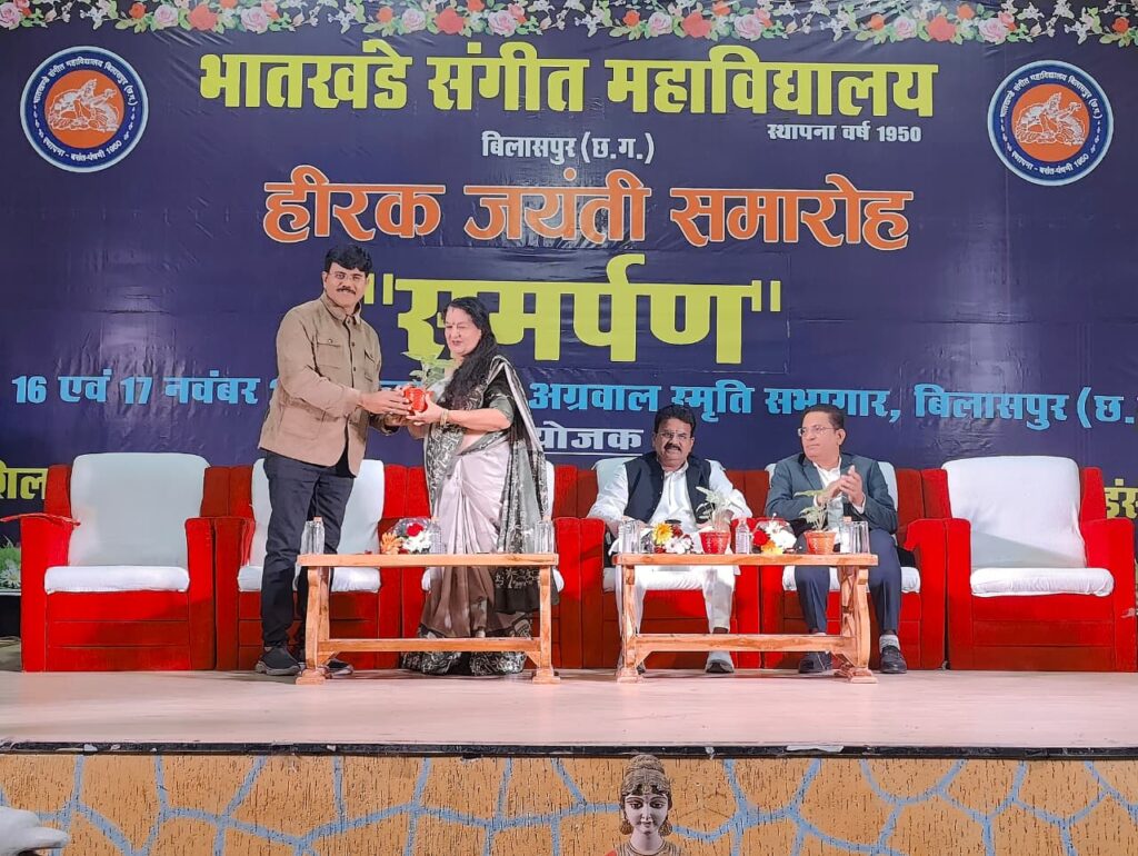 खैरागढ़। इंदिरा कला संगीत विश्वविद्यालय से संबद्ध भातखंडे संगीत महाविद्यालय, बिलासपुर ने अपनी गौरवशाली 75 वर्षों की यात्रा पूरी होने के उपलक्ष्य में भव्य हीरक जयंती समारोह आयोजित किया। इस अवसर पर विश्वविद्यालय की कुलपति प्रो.(डॉ.) लवली शर्मा मुख्य अतिथि के रूप में उपस्थित रहीं।