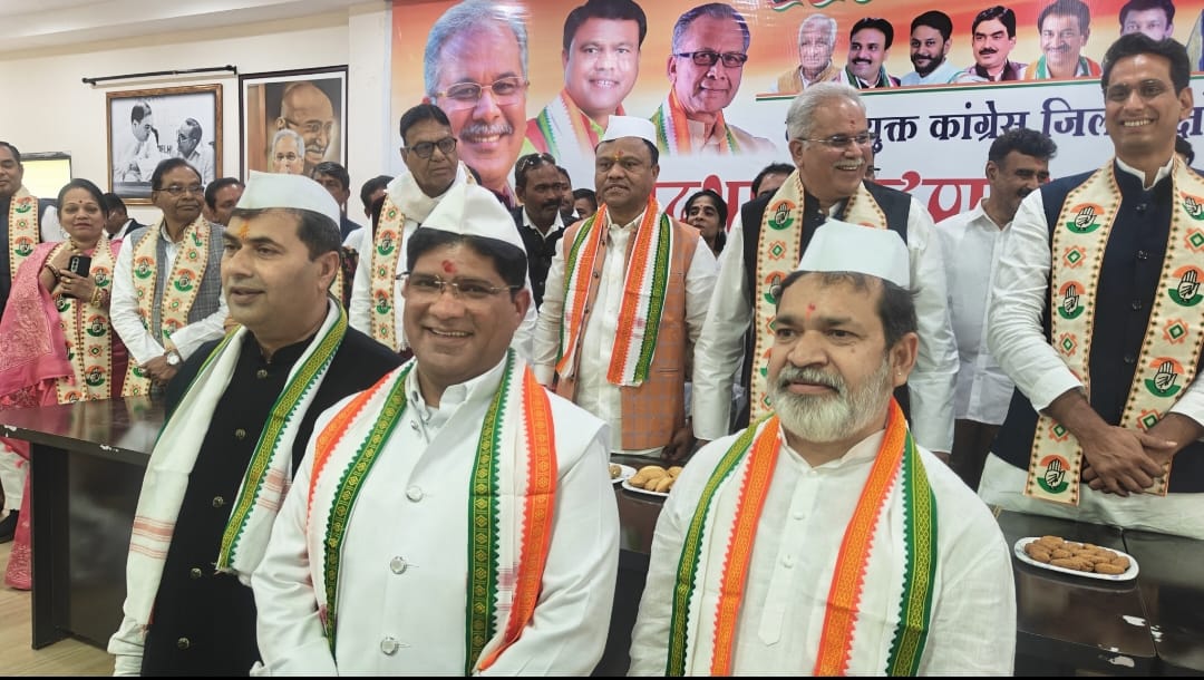 दुर्ग। राजीव भवन दुर्ग में आज कांग्रेस के तीनों जिला अध्यक्ष दुर्ग जिला ग्रामीण कांग्रेस के राकेश ठाकुर,दुर्ग शहर कांग्रेस अध्यक्ष धीरज बाकलीवाल, भिलाई शहर कांग्रेस अध्यक्ष मुकेश चंद्राकर का पदभार ग्रहण कार्यक्रम संपन्न हुआ पदभार में प्रमुख रूप से पूर्व मुख्यमंत्री भूपेश बघेल छत्तीसगढ़ प्रदेश कांग्रेस अध्यक्ष दीपक बैज पूर्व कैबिनेट मंत्री ताम्रध्वज साहू विधायक देवेंद्र यादव पूर्व विधायक अरुण वोरा की विशेष उपस्थिति में नवनियुक्त जिला अध्यक्षों ने पदभार ग्रहण किया कार्यक्रम के पूर्व नेताओं ने और नवनियुक्त जिला अध्यक्षों ने पूर्व मुख्यमंत्री स्व मोतीलाल वोरा हुआ पूर्व दुर्ग जिला कांग्रेस अध्यक्ष स्व वासुदेव चंद्राकर जी के चित्र में माल्यार्पण कर उन्हें श्रद्धांजलि दी ।कार्यक्रम मे तीनों जिला के कांग्रेस के वरिष्ठ नेता पदाधिकारी व कार्यकर्ता हजारों की संख्या में उपस्थित हुए।