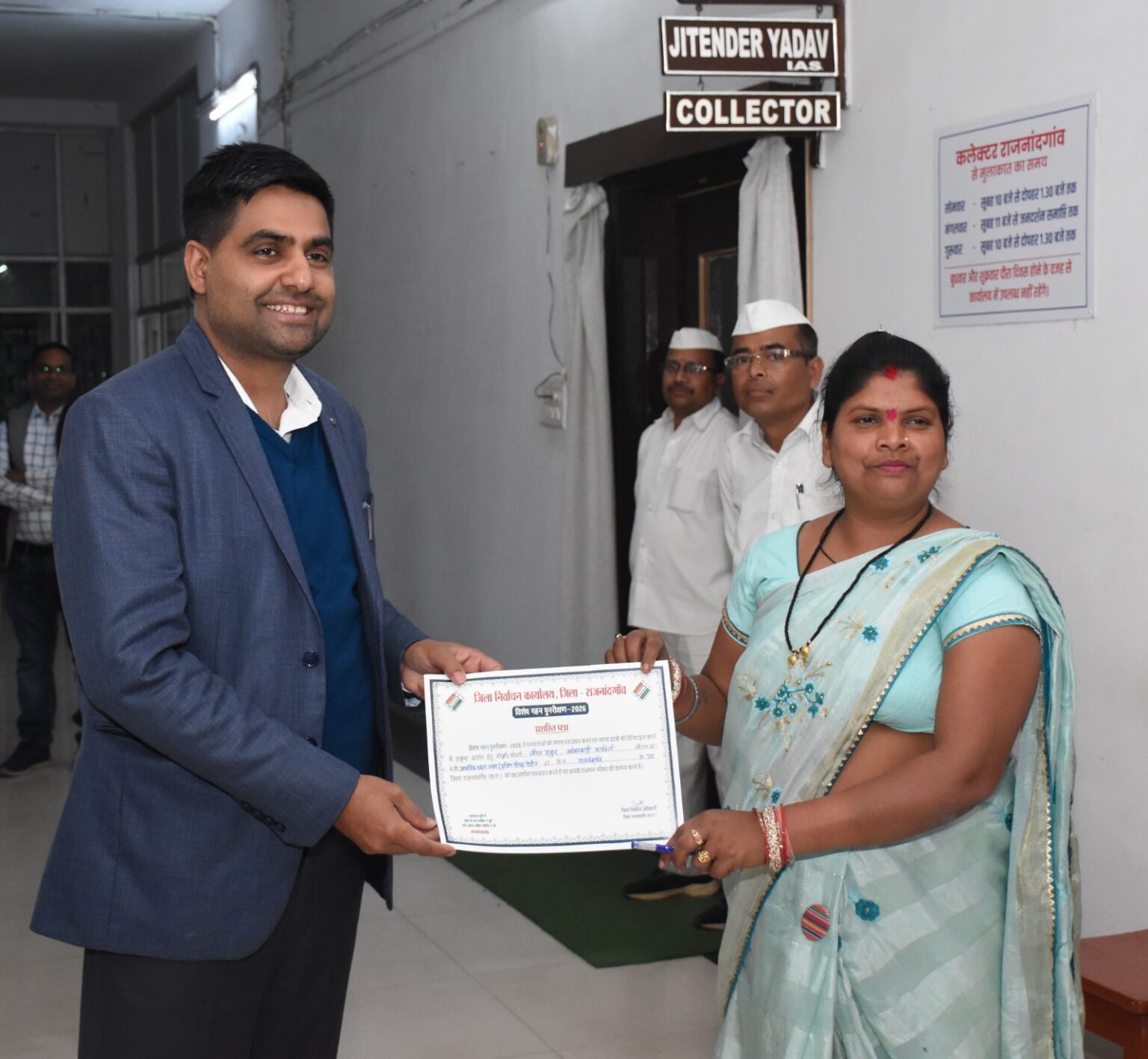 राजनांदगांव। कलेक्टर एवं जिला निर्वाचन अधिकारी श्री जितेन्द्र यादव ने कलेक्टोरेट में निर्वाचक नामावलियों के विशेष गहन पुनरीक्षण (एसआईआर) अंतर्गत उत्कृष्ट कार्य करने वाले ब्लॉक स्तर के कर्मचारियों (बीएलओ) को प्रशस्ति पत्र प्रदान कर सम्मानित किया।