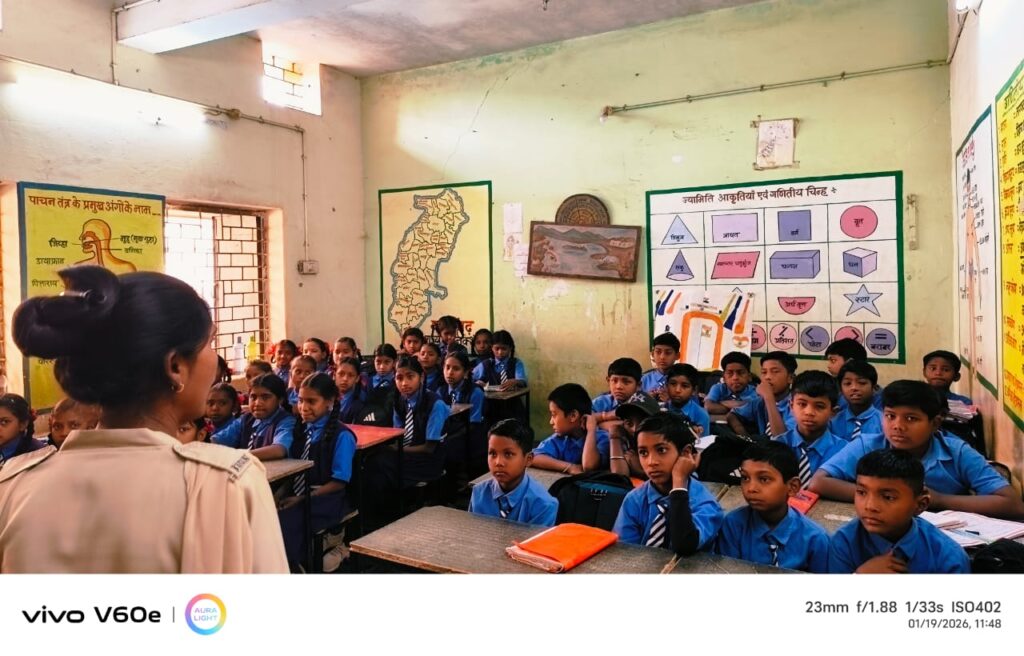 राजनांदगांव। पुलिस अधीक्षक राजनांदगांव सुश्री अंकिता शर्मा के मार्गदर्शन में आज 19 जनवरी 2026 को शासकीय पूर्व माध्यमिक शाला ग्राम लिटिया में सुरक्षा जागरूकता कार्यक्रम का आयोजन किया गया। इस कार्यक्रम में रक्षा टीम/स्टॉप महिला इकाई की महिला आरक्षक रीनू मेश्राम, आरक्षक अमित जाटवर और आरक्षक वाहन चालक शेषनारायण सिंहा ने कक्षा 1वीं से 8वीं तक के बच्चों को सेफ टच और अनसेफ टच, आत्म-सुरक्षा, नशे से बचने के उपायों और मोबाइल के दुष्प्रभावों के बारे में जानकारी दी।