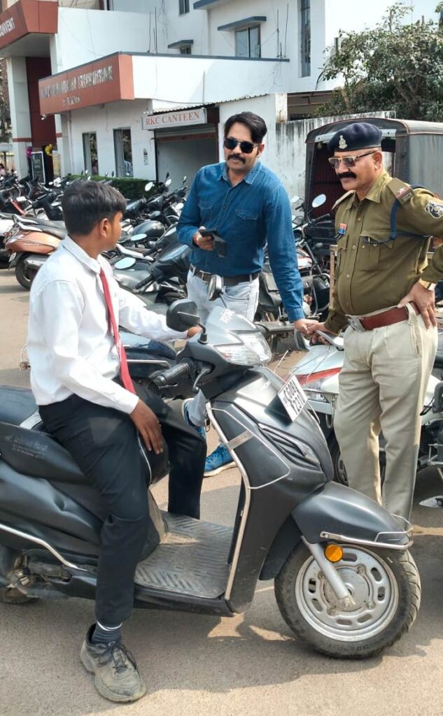 राजनांदगांव। परिवहन विभाग एवं यातायात पुलिस द्वारा चलाए जा रहे सड़क सुरक्षा माह अंतर्गत रॉयल किड्स कॉन्वेंट स्कूल के सामने जांच एवं जागरूकता अभियान चलाया गया। अभियान के दौरान यातायात नियमों का उल्लंघन करने वाले छात्रों को उनके पालकों से फोन पर चर्चा कर सड़क सुरक्षा के प्रति समझाइश दी गई। साथ ही छात्रों को हेलमेट पहनकर वाहन चलाने एवं ड्राइविंग लाइसेंस बनवाकर ही वाहन चलाने के लिए कहा।