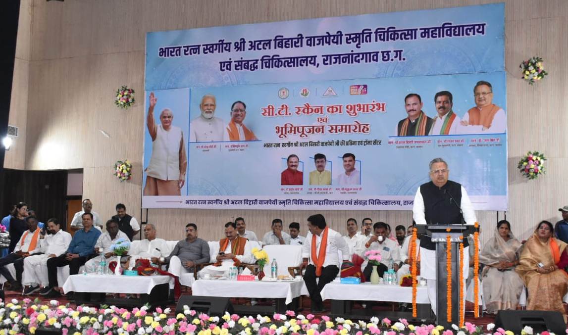 राजनांदगांव। विधानसभा अध्यक्ष डॉ. रमन सिंह ने आज भारतरत्न स्वर्गीय अटल बिहारी वाजपेयी स्मृति चिकित्सा महाविद्यालय एवं संबद्ध चिकित्सालय राजनांदगांव में सीटी स्कैन मशीन का लोकार्पण तथा पूर्व प्रधानमंत्री भारत रत्न स्वर्गीय अटल बिहारी वाजपेयी जी की आदमकद प्रतिमा एवं ट्रॉमा सेंटर स्थापना हेतु भूमिपूजन किया। इस अवसर पर उप मुख्यमंत्री एवं जिले के प्रभारी मंत्री विजय शर्मा, लोक स्वास्थ्य एवं परिवार कल्याण, चिकित्सा शिक्षा विभाग मंत्री श्याम बिहारी जायसवाल, महापौर मधुसूदन यादव एवं अन्य जनप्रतिनिधि तथा अधिकारी विशेष रूप से उपस्थित थे।