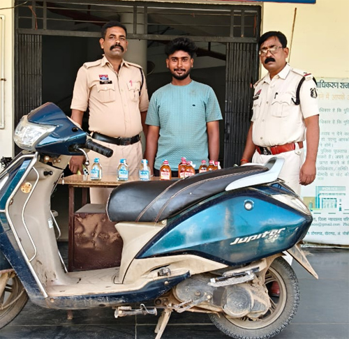 पुलिस ने जब स्कूटी की तलाशी ली तो डिक्की में प्लास्टिक बोरी के थैले में छिपाकर रखी गई कुल 17 पाव देशी शराब बरामद की गई: