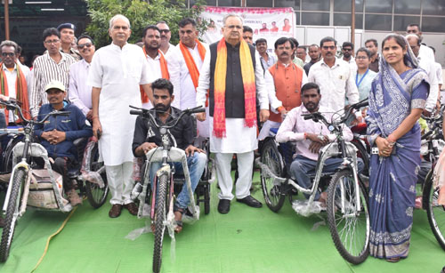 राजनांदगांव। विधानसभा अध्यक्ष डॉ. रमन सिंह के जन्म दिवस पर स्पीकर हाऊस राजनांदगांव में जिला प्रशासन एवं समेकित क्षेत्रीय केन्द्र के संयुक्त तत्वाधान में दिव्यांगजनों के लिए सहायक उपकरण वितरण समारोह का आयोजन किया गया। विधानसभा अध्यक्ष डॉ. रमन सिंह ने दिव्यांग बच्चों के साथ केक काटकर जन्मदिन मनाया। विधानसभा अध्यक्ष डॉ. सिंह ने सभी को दीपावली पर्व की हार्दिक बधाई एवं शुभकामनाएं दी। उन्होंने कहा कि छत्तीसगढ़ राज्य निर्माण के 25 वर्ष पूरे होने पर प्रदेश में छत्तीसगढ़ रजत महोत्सव का आयोजन किया जा रहा है। सेवा पखवाड़ा के तहत जिला एवं विकासखंड स्तर पर 514 से ज्यादा दिव्यांगजनों को सहायक उपकरण वितरण किया गया और शासन की विभिन्न योजनाओं से लाभान्वित किया गया। विधानसभा अध्यक्ष डॉ. सिंह ने दिव्यांगजनों को 143 सहायक उपकरणों का वितरण किया। इसके तहत दिव्यांगजनों को मोटराईज्ड ट्राईसायकल, ट्राईसायकल, बैसाखी, व्हीलचेयर, श्रवण यंत्र, स्वेज थे्रडी, एमआर किट, सपोर्ट बैड सहित अन्य उपकरणों का वितरण किया। इसके साथ ही 20 विधवा महिलाओं को राष्ट्रीय सुरक्षा योजना के तहत 20-20 हजार रूपए की सहायता प्रदान की गई। विधानसभा अध्यक्ष डॉ. रमन सिंह ने बताया कि जिले में दिव्यांगजनों के कौशल विकास, पुनर्वास और सशक्तिकरण के लिए छत्तीसगढ़ का एकमात्र समग्र क्षेत्रीय केन्द्र (सीआरसी) स्थापना की गई है। उन्होंने कहा कि दिव्यांगजनों के जीवन को सरल बनाने के लिए सहायक उपकरण का वितरण किया गया है। जिसका दिव्यांगजन दैनिक जीवन में उपयोग जरूर करें। उन्होंने कहा कि दिव्यांगजनों को सभी जनप्रतिनधियों, वरिष्ठजनों एवं नागरिकों का आशीर्वाद हमेशा मिलता रहेगा।